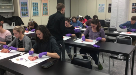 Parmi toutes les activités organisées au Campus Saguenay, l’atelier des points de suture est sans aucun doute l’une des plus populaires. Ce classique, qui revient chaque année, est une occasion unique pour les étudiants d’apprendre différentes techniques de points de suture en ayant tout le matériel et les pattes de cochon à leur disposition. Des externes et résidents étaient sur place pour faire des démonstrations et donner des conseils.